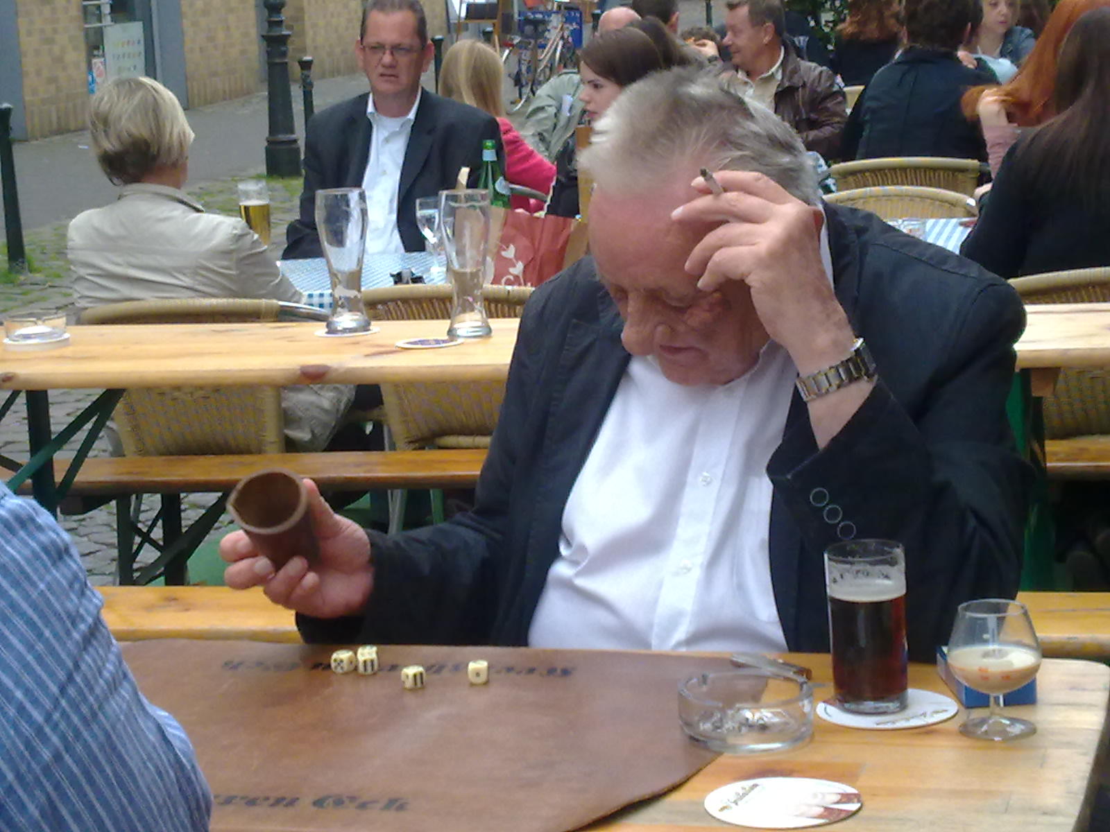 Eine Kneipe wie ein Wohnzimmer. Seit dem Eröffnungsjahr 1954 hat sich nicht viel geändert: 30 Quadratmeter mit Tresen, Schnapsregal, Barhockern und Fässchen. Was will man mehr? Hier füllt der Mensch den Platz. An so einem Ort beginnen die ausschweifenden Monologe über die Welt und was sie zusammenhält mit der Ankündigung:"Isch red' mal aus der Kneipe..." (Zitat aus Merian Düsseldorf)