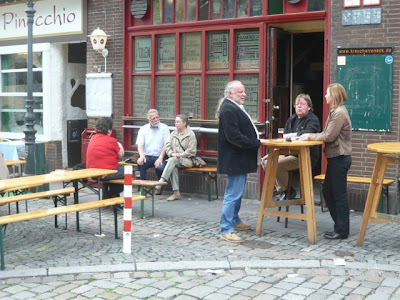 Eine Kneipe wie ein Wohnzimmer. Seit dem Eröffnungsjahr 1954 hat sich nicht viel geändert: 30 Quadratmeter mit Tresen, Schnapsregal, Barhockern und Fässchen. Was will man mehr? Hier füllt der Mensch den Platz. An so einem Ort beginnen die ausschweifenden Monologe über die Welt und was sie zusammenhält mit der Ankündigung:"Isch red' mal aus der Kneipe..." (Zitat aus Merian Düsseldorf)