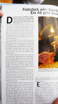 Eine Kneipe wie ein Wohnzimmer. Seit dem Eröffnungsjahr 1954 hat sich nicht viel geändert: 30 Quadratmeter mit Tresen, Schnapsregal, Barhockern und Fässchen. Was will man mehr? Hier füllt der Mensch den Platz. An so einem Ort beginnen die ausschweifenden Monologe über die Welt und was sie zusammenhält mit der Ankündigung:"Isch red' mal aus der Kneipe..." (Zitat aus Merian Düsseldorf)