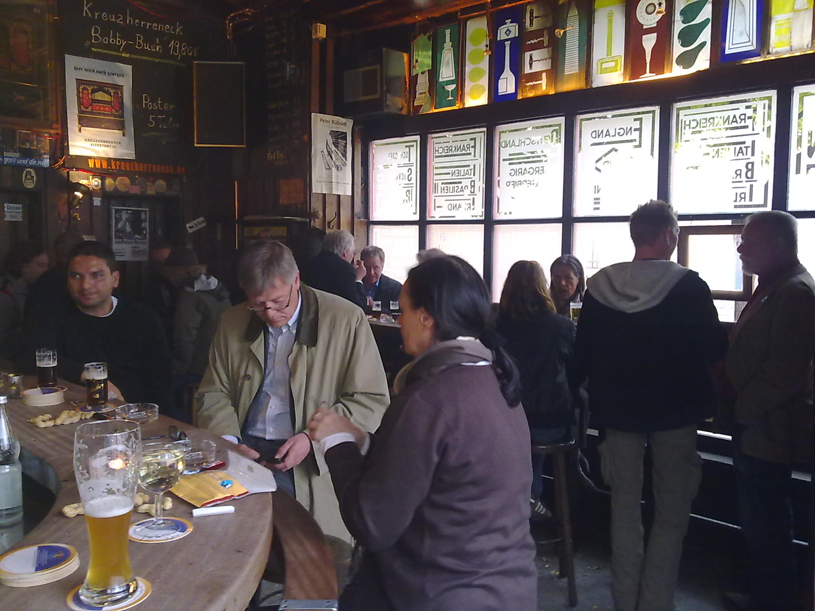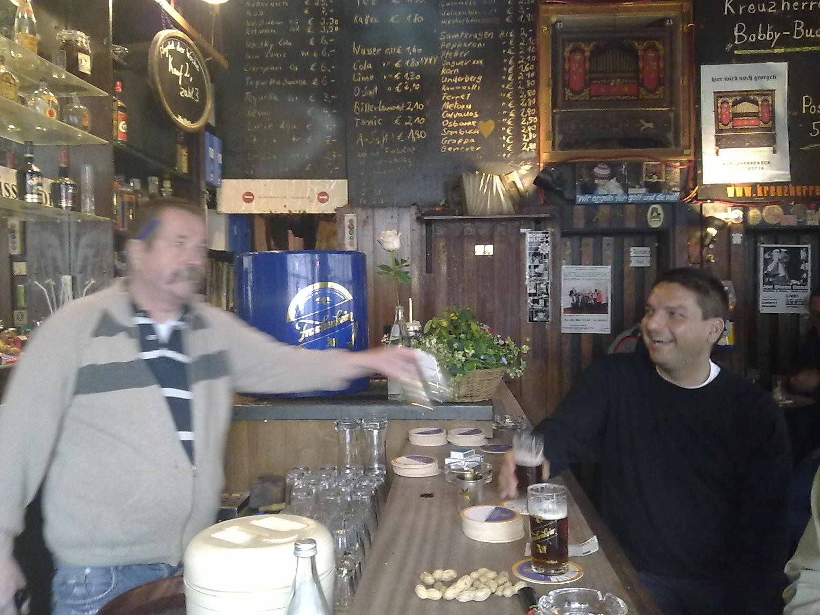 Eine Kneipe wie ein Wohnzimmer. Seit dem Eröffnungsjahr 1954 hat sich nicht viel geändert: 30 Quadratmeter mit Tresen, Schnapsregal, Barhockern und Fässchen. Was will man mehr? Hier füllt der Mensch den Platz. An so einem Ort beginnen die ausschweifenden Monologe über die Welt und was sie zusammenhält mit der Ankündigung:"Isch red' mal aus der Kneipe..." (Zitat aus Merian Düsseldorf)