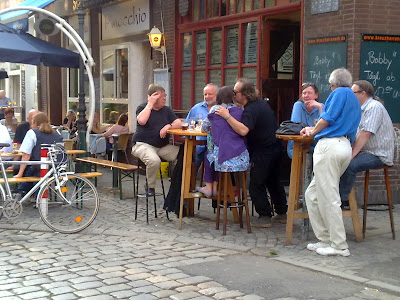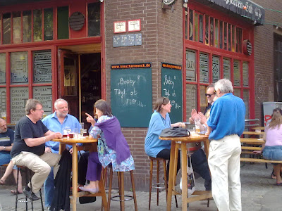 Eine Kneipe wie ein Wohnzimmer. Seit dem Eröffnungsjahr 1954 hat sich nicht viel geändert: 30 Quadratmeter mit Tresen, Schnapsregal, Barhockern und Fässchen. Was will man mehr? Hier füllt der Mensch den Platz. An so einem Ort beginnen die ausschweifenden Monologe über die Welt und was sie zusammenhält mit der Ankündigung:"Isch red' mal aus der Kneipe..." (Zitat aus Merian Düsseldorf)